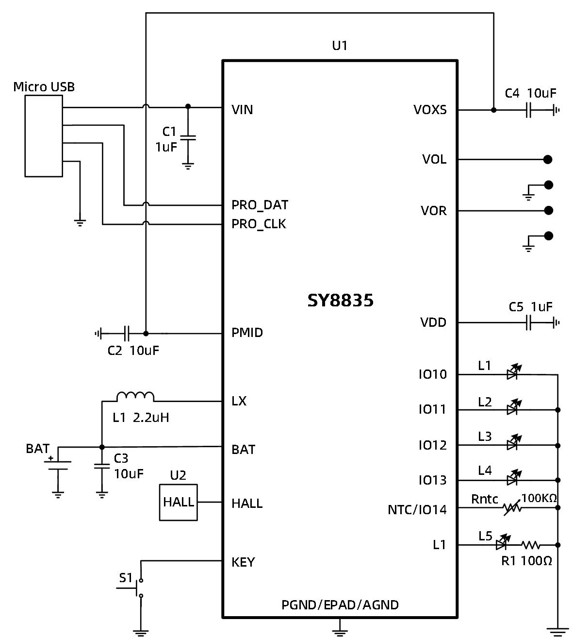 SY8835集成了通信模块,可以实现耳机仓到耳机端的高速通信,非常适合蓝牙耳机充电仓的设计。SY8835的高集成度极大简化了外围电路和元器件,为蓝牙耳机充电仓的应用提供了简单易用的方案。
