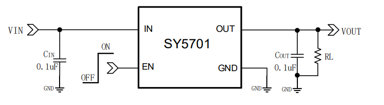 SY5701是一颗小型,低RON,超低功耗,快速开启的load switch,最大支持1A电流。低于20nA的工作电流可支持应用在智能手表、手环等功耗敏感的设备上。SY5701包含1个60mΩ(典型应用)P沟道 MOSFET,可在1.1V至5.5V的输入电压下工作。可通过EN脚控制开关,1V的较低控制电压即可开启开 关,支持1.2V I/O控制应用。EN脚内部有智能的下拉 电阻,在EN未拉高时,接入一个典型值为500kΩ的对地电阻,保证EN脚状态,EN脚升高状态翻高时,断开下拉电阻,保证低功耗。SY5701内部做了开启速度控制,可在快速开启的同时抑制浪涌电流。典型应用下输出开启时间为 100us。 SY5701采用FOCSP- 4封装,面积0.76mm*0.76mm,0.4mm pitch,同时也支持DFN-1mm*1mm-4L小型封装。