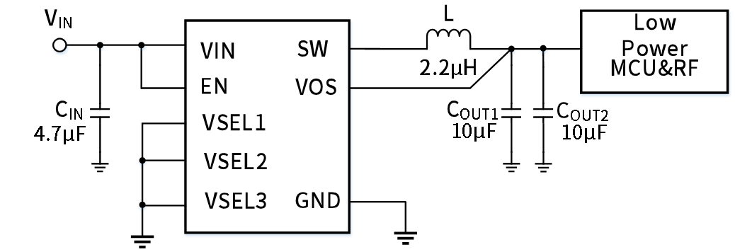The SY5112 default provides eight programmable output voltages, which can be selected in the 1.2V to 3.3V range with three selection pins.