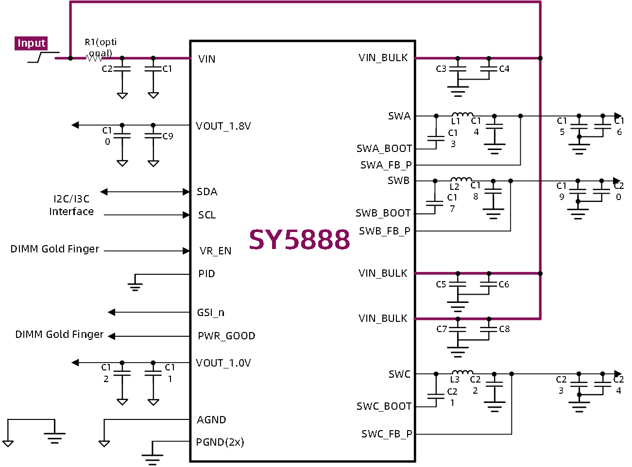 VOUT_1.8V/VOUT_1.0V LDOs are intended to power supply SPD hub and Temp Sensor on DIMM. SY5888 is available FC-QFN28 3mmx4mm package, and is halogen and lead free, compliant with RoHS.