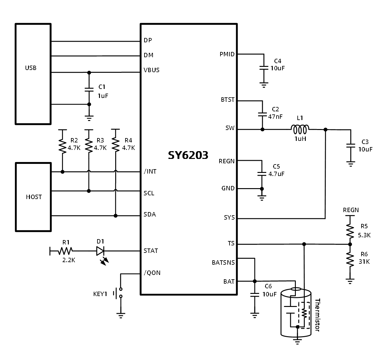 The SY6203 is a highly integrated 3A switch-mode battery charge management and system power path management device for single cell Li-Ion and Li-polymer batteries. It integrates charge management, boost converter and protections.